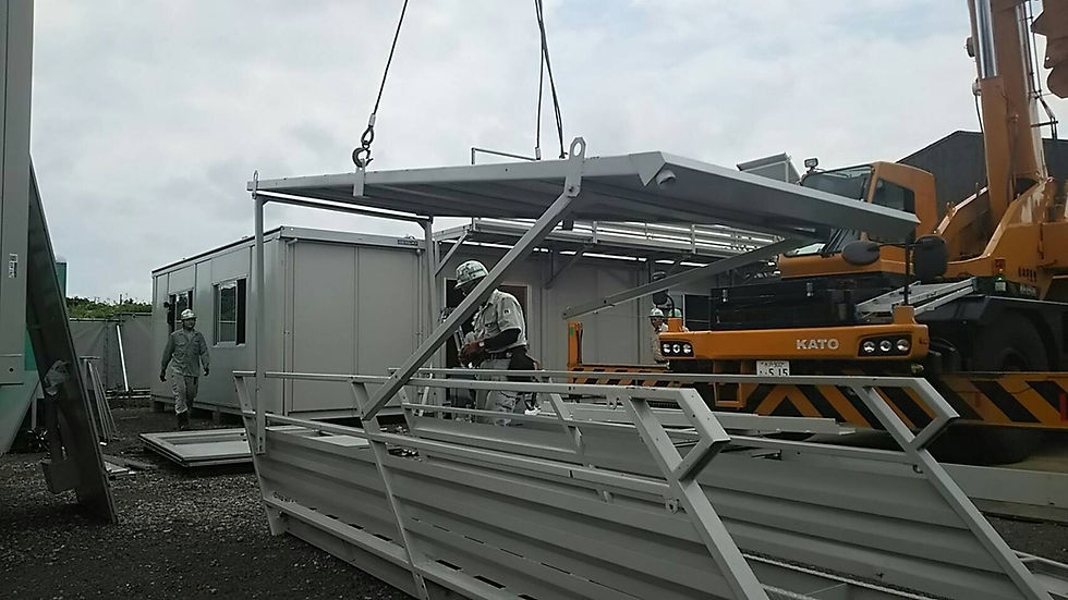 ①トラックで現場まで輸送します。 ②クレーンで屋根を吊りあげて組み立てます。 ③エアコン取り付けや電気配線などの施工及びメンテナンスをします。